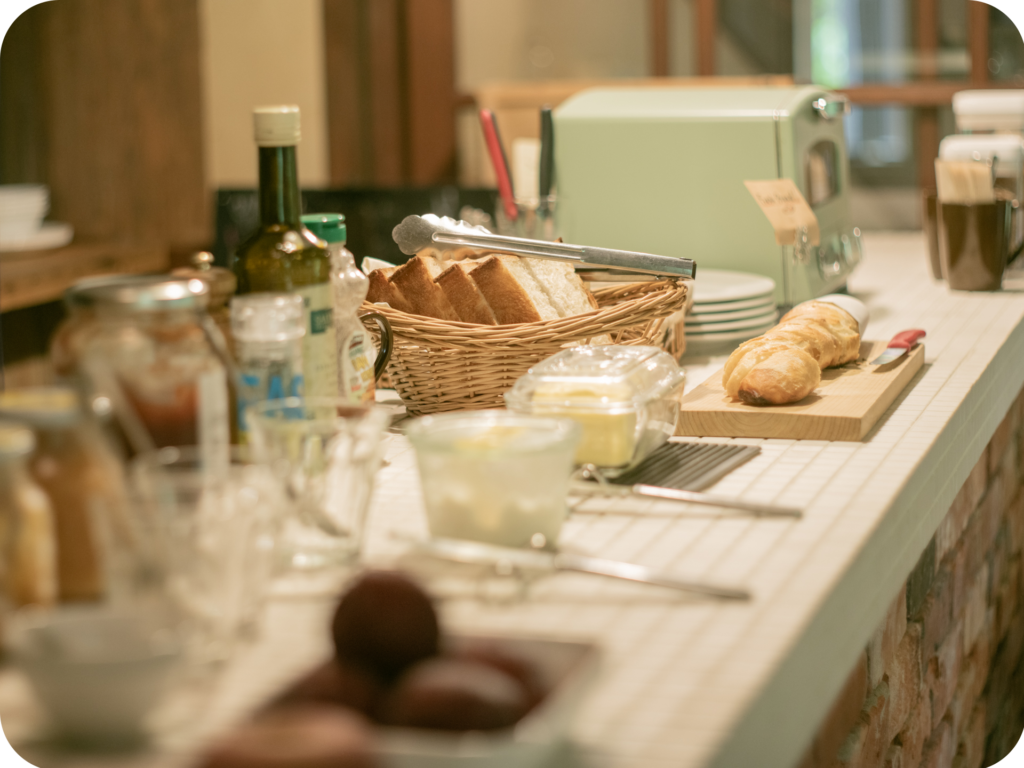 朝食は自家製パン、シリアル、フルーツなどをご用意
