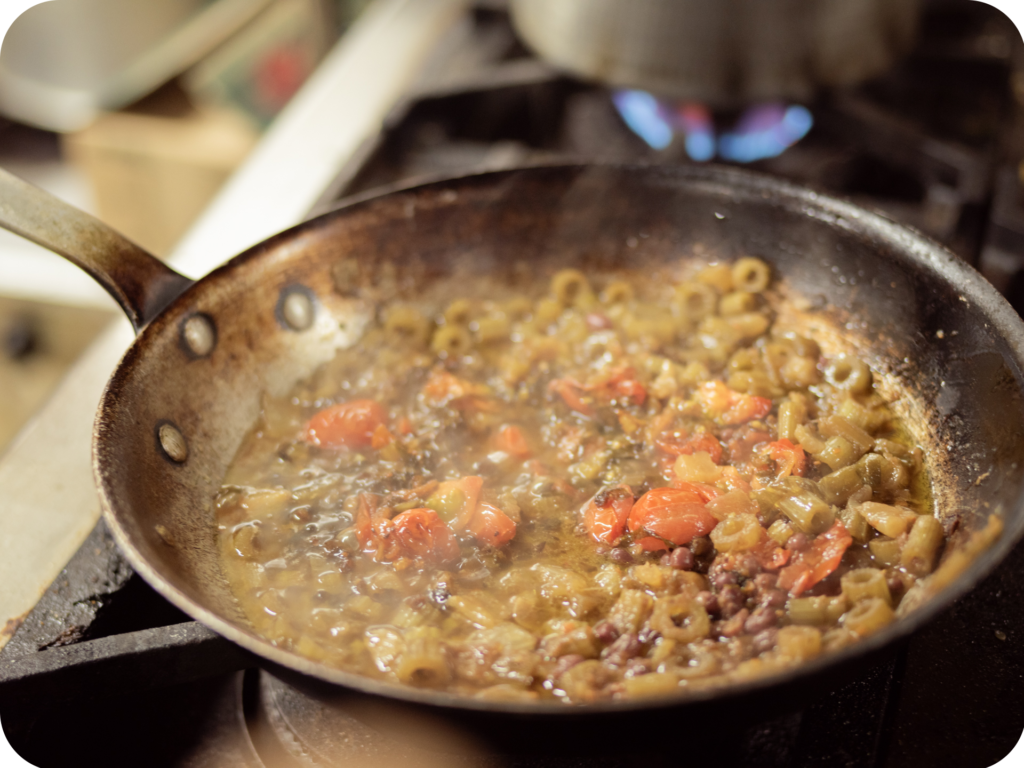 夕食は旬の野菜をたっぷり使ったパスタ料理