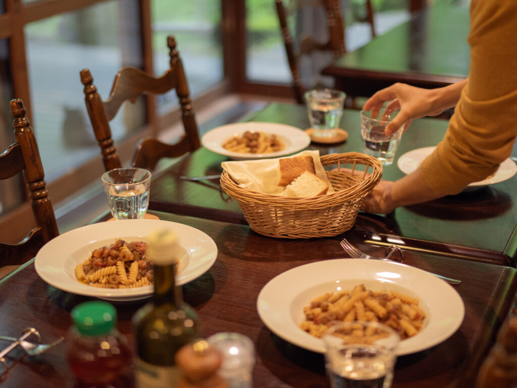 夕食:パスタセット:スープ、地域の旬の素材を使ったパスタ、パン ………¥1,650