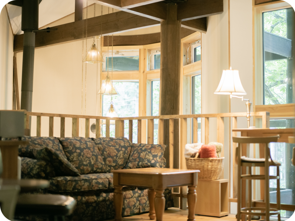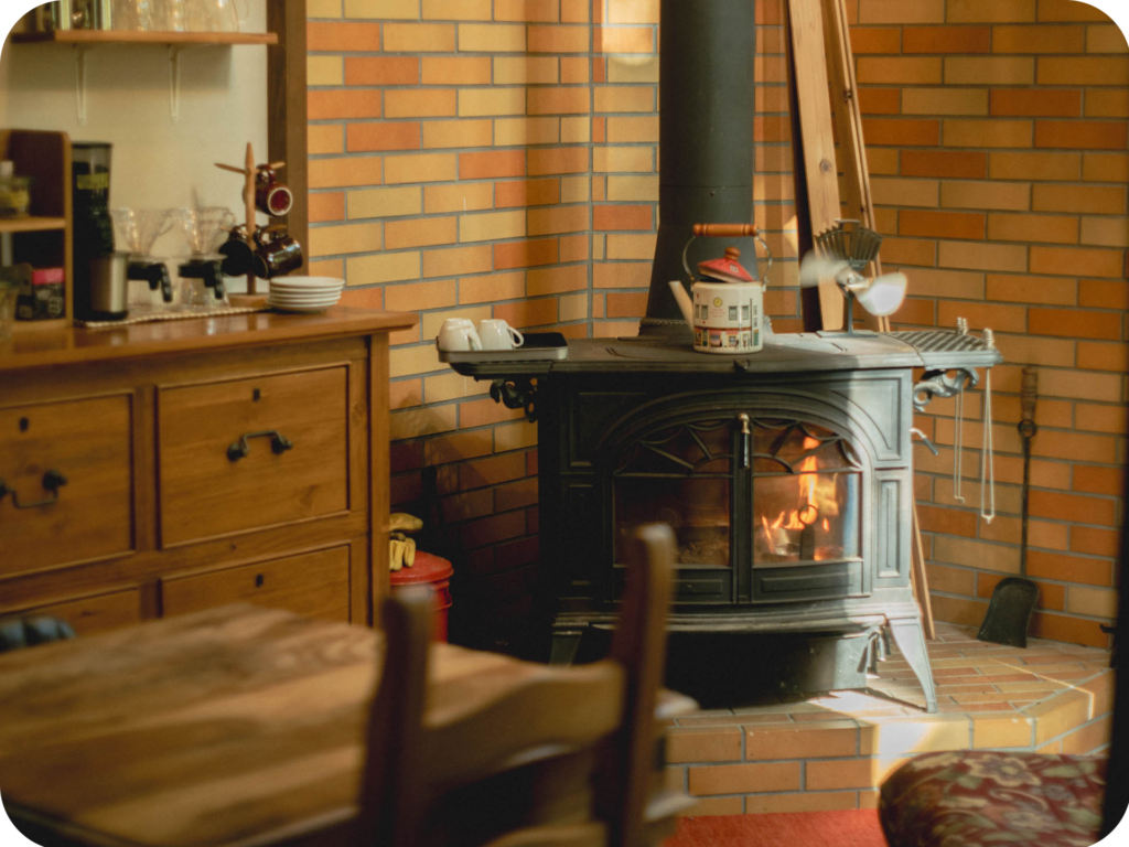 薪ストーブを囲うラウンジでくつろぎの時間を