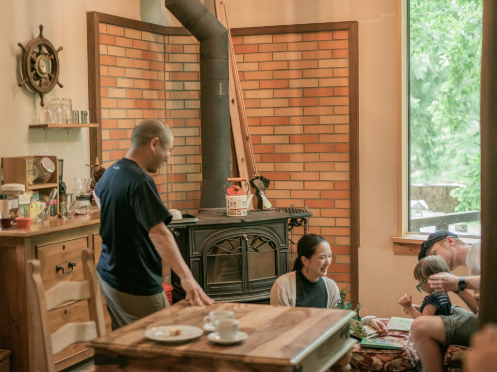 思いっきり遊んだら、くつろぎの時間を。薪ストーブを眺めながらソファで。吹き抜けのラウンジで。木漏れ日が差し込むウッドデッキで。ゆったりとお過ごしください。ラウンジでは、コーヒーや紅茶、自家製ビスコッティをご用意しています。